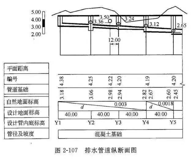 表示地面起伏情况,管道敷设深度,管道直径及坡度,与其他管道交接情况。