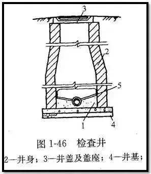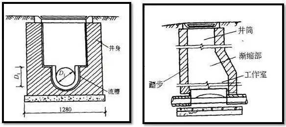 不需要下井的浅检查井,井身为直壁圆筒形;需要下井的其井身在构造上分为井室、渐缩部、井筒三个部分。