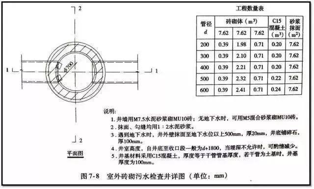 井室直径不小于1m,井筒直径不小于0.7m。井室与井筒间以渐缩部连接。也可在井室上加钢筋混凝土盖板,在盖板上砌筑井筒。