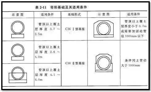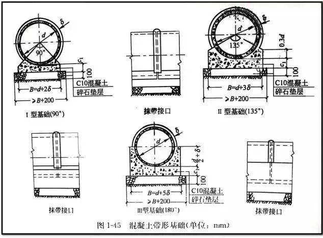 按管座的形式,分为90度、135度、180度、360度四种管座基础,根据管道埋置深度选择。