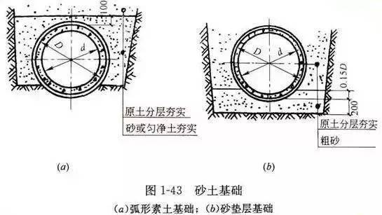 适用于土壤条件非常好、无地下水的地区,管道直径小于600mm,管顶覆土厚度在0.7~2.0m之间的管道,不在车行道下的次要管道及临时性管道。